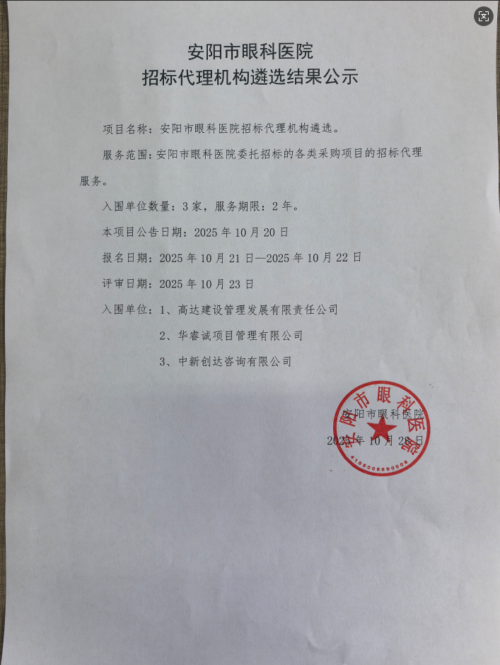 安阳市眼科医院招标代理机构遴选结果公示